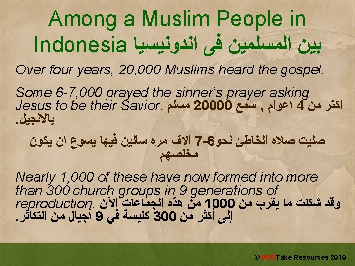 Any 3 Anyone Anywhere Any Time WIGTake Resources Slides: 11 Download presentation Any - 3 Anyone, Anywhere, Any Time ��� �� ������ © WIGTake Resources 2010 Churches Planting Churches © WIGTake Resources 2010 Any 3: Anyone, Anywhere, Any Time Five “Gets” 1. Get Connected 2. Get to God 3. Get to Lostness 4. Get to the Gospel 5. Get to a Decision © WIGTake Resources 2010 Get Connected Be a friend The lost are future family © WIGTake Resources 2010 Get to God What is your religion? How do you please God? © WIGTake Resources 2010 Get to Lostness How is that working for you? Do you know that you will be in heaven when you die? © WIGTake Resources 2010 Get to the Gospel What I believe is different. Jesus (Isa al-Masih) is God’s sacrifice for my sins © WIGTake Resources 2010 Get to a Decision Do you believe what I’ve told you? You can have that same assurance of salvation. Let me pray with you, right now. © WIGTake Resources 2010 Any 3: Anyone, Anywhere, Any Time Five “Gets” 1. Get Connected 2. Get to God 3. Get to Lostness 4. Get to the Gospel 5. Get to a Decision © WIGTake Resources 2010 Small Group Exercise Form groups of 2 - 3 and take turns practicing Any 3 with one another. © WIGTake Resources 2010