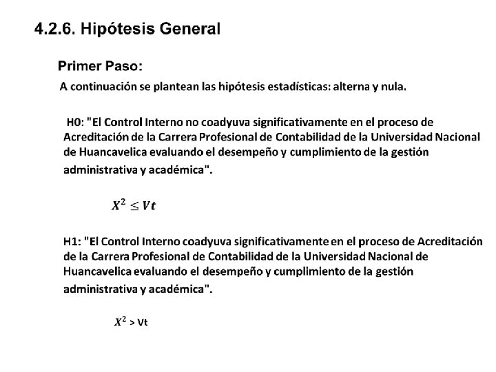 Hipótesis de investigación El Control Interno coadyuva significativamente en el proceso de Acreditación de la Carrera Profesional de Contabilidad en la Universidad Nacional de Huancavelica evaluando el desempeño y cumplimiento de la gestión administrativa y académica. Hipótesis especificas a. La aplicación del componente de ambiente de control en el proceso de etapa previa contribuye significativamente en el proceso de acreditación de la Carrera Profesional de Contabilidad de la Universidad Nacional de Huancavelica. b. La adecuada aplicación de la evaluación de riesgos, debe realizar en forma previa, concurrente y posterior de tal modo que contribuya en el proceso de autoevaluación en la Carrera Profesional de Contabilidad en la Universidad