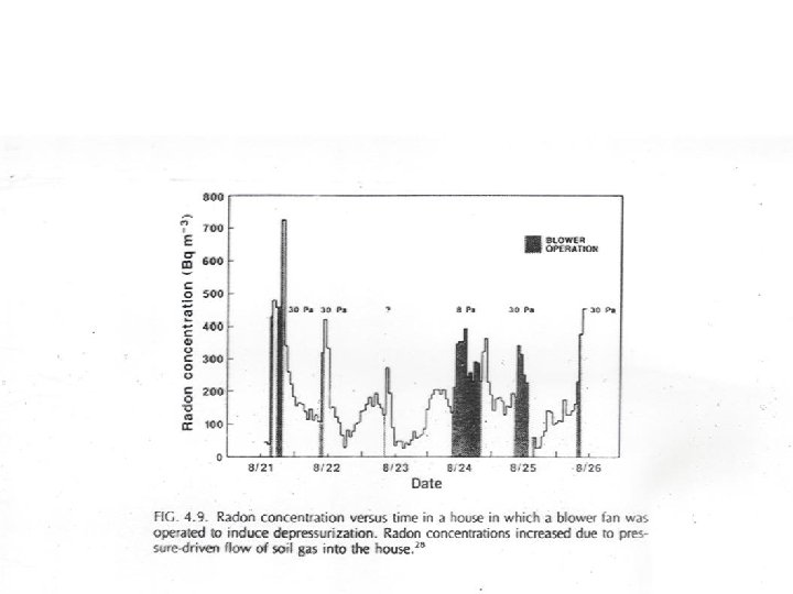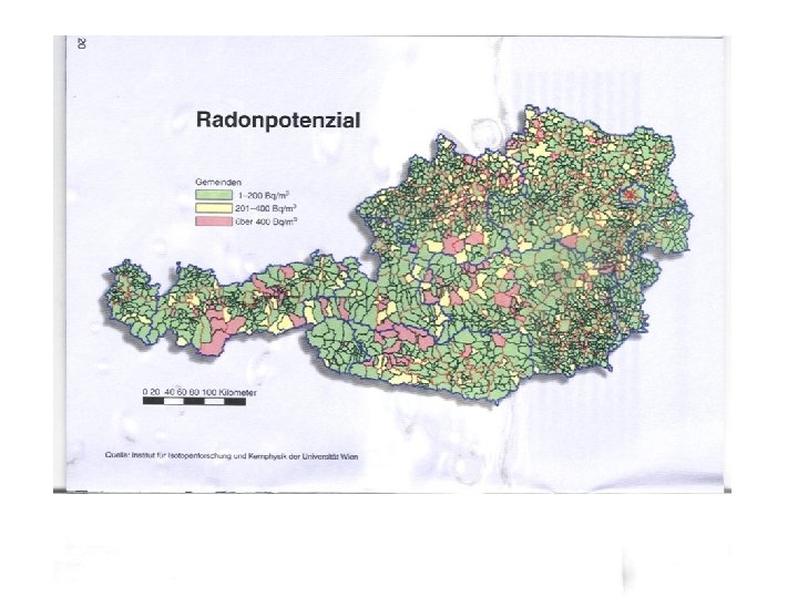 Radon Rn-222 - Konzentrationen im Freien: 4 -10 Bq/m 3 (1 Bq = 1 Zerfall pro Sekunde) In Häusern kann die Rn-Konzentration viel höher sein: Ab 400 Bq/m 3 müssen Maßnahmen zur Reduktion ergriffen werden, wie z. B. Keller besser abdichten, Bodenluft unter dem Haus absaugen… Neubauten sollten 200 Bq/m 3 nicht überschreiten Eine Konzentration von 60 Bq/m 3 bewirkt eine jährliche Dosis von 1 m. Sv. Die jährliche mittlere Strahlenbelastung beträgt bei uns 2 -3 m. Sv (alles zusammen, wie im Bild vorher angegeben), kann aber aufgrund unterschiedlicher Wohnverhältnisse auf bis zu 70 m. Sv ansteigen.