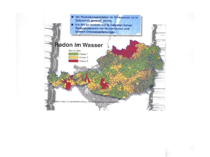 Österreichisches Trinkwasser Nur die Ra-Isotope liefern relevante Beiträge zur Effektivdosis! 210 Pb und 210 Po jeweils < 5 m. Bq/L Ra-226: 9 von 100 Proben über 10 m. Bq/L Waidhofen/Th. 110 m. Bq/L ↔ 0. 02 m. Sv/a (0. 13 m. Sv/a 3 m) Retz 80 Eberstein K. 48 Hermagor K. 38 Heilstollen 32 Eisgarn, Horn 30 Schrems 23 Freistadt 19 Ra-228: 17 von 23 Proben im Waldviertel 10 -26 m. Bq/L Kamegg 10 m. Bq/l ↔ 0. 005 m. Sv/a (0. 08 m. Sv/a 3 m) Forstau S. 17