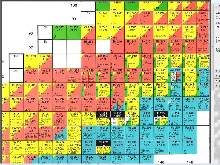 Wie liest man die Karten mit den Zerfallsreihen? Rechts oben das jeweils langlebigste Nuklid ist das Mutternuklid, das noch von der Elementsynthese aus der „Geburtsstunde“ unseres Sonnensystems übrig ist (vor ca. 4 -5 Milliarden Jahren) Der Pfeil 2 Felder nach links bedeutet: α-Zerfall Der Pfeil 1 Feld nach unten und 1 Feld nach rechts: β-Zerfall (dieser Pfeil fehlt leider manchmal, bitte selbst ergänzen) Es gibt noch eine 3. Zerfallsreihe ausgehend von U-235 Verhältnis U-235/U-238= 0. 007, d. h. U-235 ist sehr selten Eine 4. Zerfallsreihe ausgehend von Np-237 ist bereits ausgestorben, da die HWZ der Mutter nur 2, 14 Millionen Jahre beträgt (seit der Elementsynthese sind also bereits 1000 HWZ vergangen…)