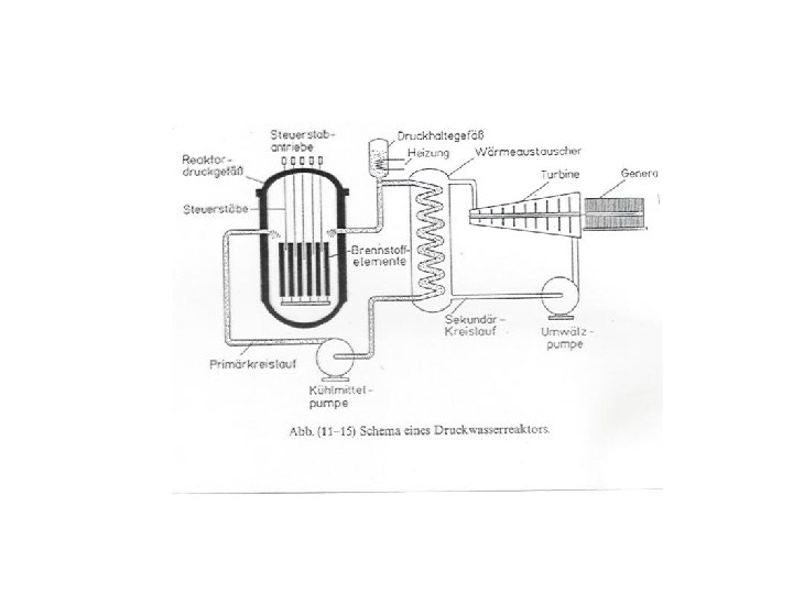 Der Kernreaktor U-235 muss auf ca. 3% angereichert werden 2 von den 3 entstehenden Neutronen müssen absorbiert werden – wird vom U-238 erledigt; damit nicht alle 3 Neutronen absorbiert werden muss der Querschnitt der Brennelemente rel. klein sein Die Neutronen müssen auf thermische Energien abgebremst werden, damit sie das U-235 spalten können – Moderator Wasser (Graphit) Das Wasser wird erhitzt, gibt seine Energie über einen Wärmetauscher an einen Sekundärkreislauf ab → Turbine Ein gut gewartetes KKW gibt weniger Radioaktivität an die Umwelt ab als ein Kohlekraftwerk!