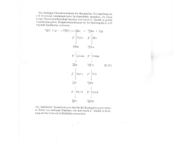 ABER: es passiert noch etwas anderes! Im natürlichen Uran befindet sich auch U-235, das durch langsame Neutronen gespalten wird!!! O. Hahn (Chemiker!) konnte nachweisen, dass sich die Produkte der Reaktion mit den Neutronen chemisch wie Barium verhalten und nicht wie Transurane (Ende 1938) Bei der Spaltung werden wieder 2 -3 Neutonen frei → Kettenreaktion!!! Außerdem ca. 200 Me. V Energiegewinn pro Spaltung!!! 1 g U-235: 7, 9*1010 J 1 g C: 4*102 J