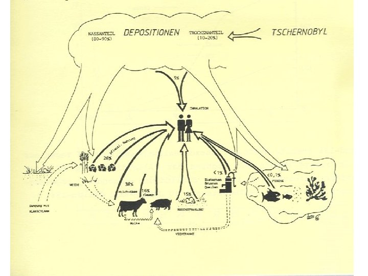 Die Zufuhr radioaktiv verseuchter Lebensmittel verursachte ca. 80% der Gesamtdosis Pflanzen, die direkt dem fallout ausgesetzt waren, waren stark belastet; über das Futter besonders Milch, Milchprodukte und Fleisch belastet. I-131 nur kurzfristig problematisch, allerdings Anreicherung in der Schilddrüse! Cs-137 und Cs-134 längerfristig am wichtigsten; durch Fütterung mit unbelastetem Futter einige Wochen vor der Schlachtung starke Reduzierung der Fleisch-Belastung Die Radionuklide werden im Boden fest gebunden, werden dann kaum mehr von den Pflanzen aufgenommen
