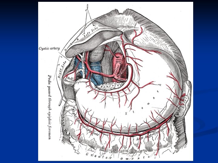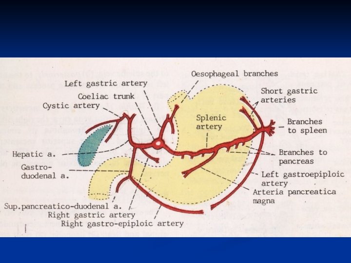 Coeliac Artery n n n Short thick trunk ≈1. 25 cm length Arises from the front of the aorta, just below the aortic hiatus of the diaphragm n n n Between T 12 & L 1 Passing nearly horizontally forward 3 large branches n n n Left gastric A - smallest Hepatic A Splenic A - largest