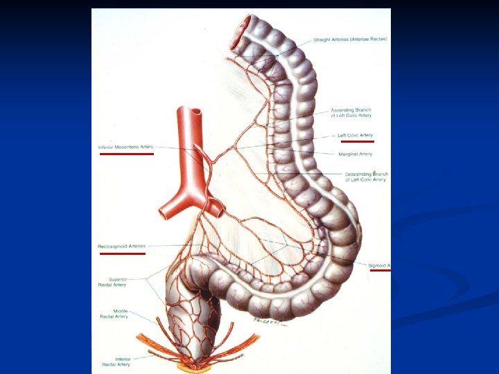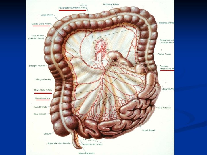Inferior Mesenteric Artery Smaller than SMA n Arises from aorta at L 3, about 3 or 4 cm above its division n Passes downward, posterior to the peritoneum n Continued into pelvis as Superior hemorrhoidal artery & ends on the upper rectum n Supply Lt ½ transverse colon, descending & sigmoid colon, and most of the rectum n