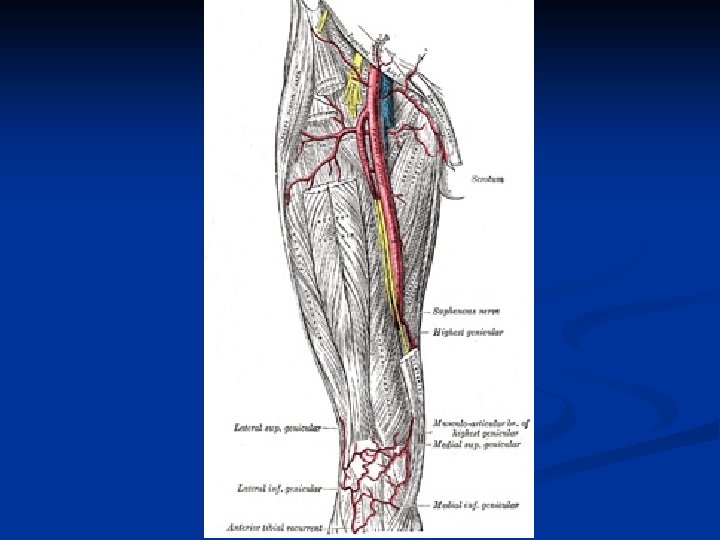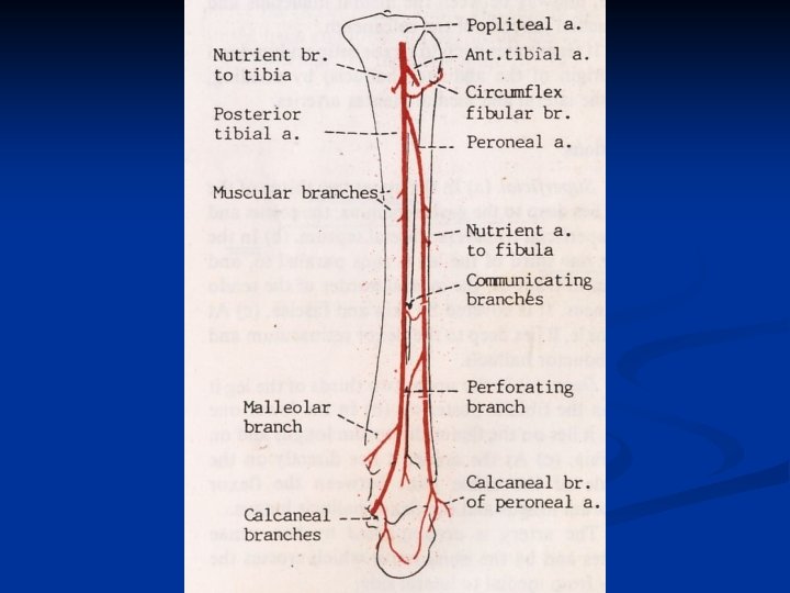 Popliteal Artery n n n Continuation of Femoral A Extends from the opening in the Adductor magnus, at the junction of middle ⅔ & lower ⅓ of thigh Courses downward and lateralward to the intercondyloid Popliteal fossa of the femur, then vertically downward to the lower border of the Popliteus Divides into Anterior tibial A and tibioperoneal trunk. Tibioperoneal trunk is the direct continuation of the popliteal artey, arises distal to the anterior