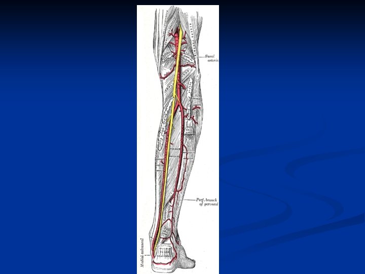 Posterior Tibial A n n Begins at lower border of Popliteus, opposite the interval betw tibia & fibula Descends, approaching tibial side of leg In the lower part, situated midway betw med malleolus & med process of calcaneal tuberosity Divides into Medial & Lateral plantar A
