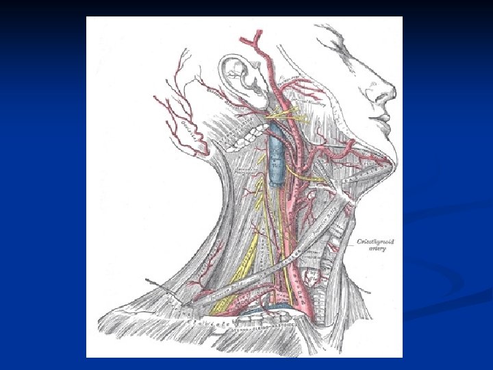 Common Carotid Artery n n n 2 in number (Rt & Lt) Differ in length and mode of origin The right begins at bifurcation of innominate A, behind sternoclavicular joint and is confined to the neck. The left springs from the highest part of arch of the aorta to the left of, on a plane posterior to the innominate artery Each vessel passes obliquely upward Divides into the ECA & ICA, at the level of upper border of the thyroid cartilage