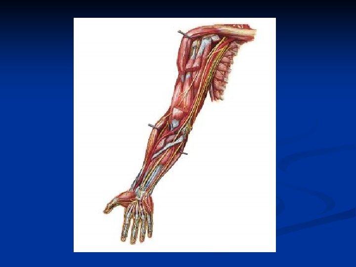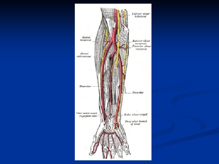 Radial Artery n n n Continuation of the brachial Smaller in caliber than ulnar. Commences at bifurcation of the brachial, just below the bend of the elbow Passes along the radial side of the forearm to the wrist Then winds backward, around the lateral side of the carpus, forward toward thumb and index finger into the palm of the hand unite with the deep volar branch of the ulnar artery to form the deep volar arch