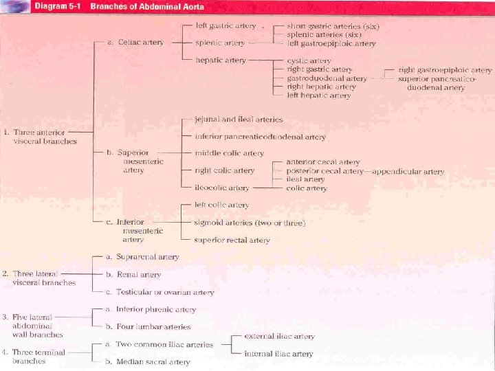 Aorta The aorta enters the abdomen through the aortic opening of the diaphragm in front of the 12 th thoracic. It descends behind the peritoneum on the anterior surface of the bodies of the lumbar vertebrae. At the level of the 4 th lumbar vertebra, it divides into the 2 common iliac arteries. On its right side lie the inferior vena cava the cisterna chyli and the beginning of the azygos vein. On its left side lies the sympathetic trunk Branches 3 ( single ) anterior visceral branches: celiac; superior and inferior mesenteric. 3 ( paired ) lateral visceral branches: suprarenal; renal and gonadal. 5 ( paired ) lateral abdominal wall branches: inferior phrenic and 4 lumbar arteries. 3 ( single ) terminal branches: 2 common iliac and the median sacral arteries