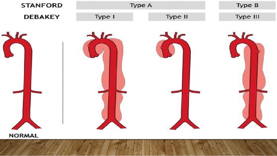 CLASSIFICATION • There are two main anatomic classifications used to classify aortic dissection. #The Stanford system is more frequently employed. It classifies dissections into two types based on whether ascending or descending part of the aorta involved. type A : any dissection that involves the Ascending aorta & propagate to Arch & descending aorta ( the origin from anywhere in this path ) Account for 60% of the aortic dissection