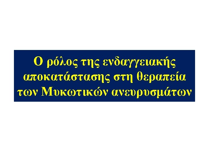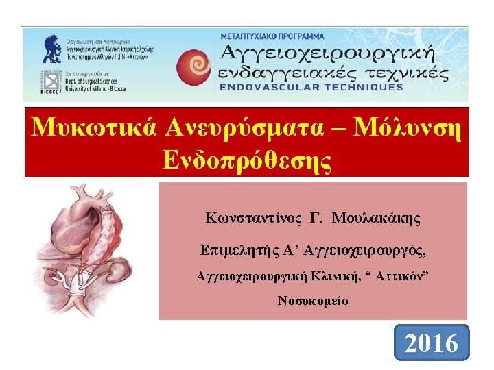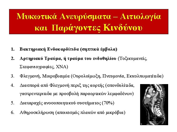 Εμπλεκόμενοι Μικροοργανισμοί Θετικές Καλλιέργειες ≈ 62 % • Staphylococcus sp. 20 % • Salmonella 12 % ↑f • Streptococcus sp. 11 % • Other 19 % (Pseudomonas aeruginosa, E coli, Enterobacterium faecium, Prot. mirabilis, Serratia sonticola, Bacteroides fr. , Bacillus cereus, Tuberculous species, Listeria monocytogenes, Coxiella bruneti, Candida albicans) Sörelius K, Mani K, Björck M, Sedivy P, Wahlgren CM, Taylor P, Clough RE, Lyons O, Thompson M, Brownrigg J, Ivancev K, Davis M, Jenkins MP, Rancic Z, Mayer D, Brunkwall J, Gawenda M, Kölbel T, Jean-Baptiste E, Moll F, Berger P, Liapis CD, Moulakakis KG, Larzon T, Pirouzram A, Wanhainen A; European MAA collaborators. Endovascular treatment of mycotic aortic aneurysms: a European multicenter study. Circulation. 2014