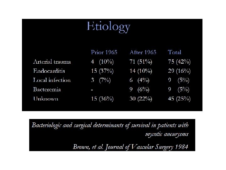 Aortic Infection • Osler used the term "mycotic aneurysm" in 1885 when he described arterial aneurysms occurring in patients with bacterial endocarditis. • Mycotic aneurysms are the result of septic emboli originating from endocarditis in a normal or atherosclerotic aorta, which subsequently is degenerated and enlarged. • Aneurysms associated with preexisting endocarditis or infection are secondary aneurysms. • An infected aneurysm occurs when a preexisting aneurysm is exposed to bacteremia. 1. Clagett GP. Vascular infection. In: Greenfield L, Mulholland M, Oldham K, Zelenock G, editors Surgery: scientific principles and practice 3 rd ed Williams, and Wilkins, Philadelphia: Lippincott; 2001 Gelabert H, William J. Mycotic aneurysm of the suprarenal aorta secondary to Streptococcus pneumoniae: an unusual pathogen. Ann Vasc Surg 1991; 5: 529 -32.