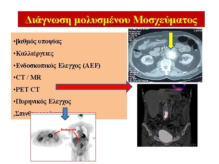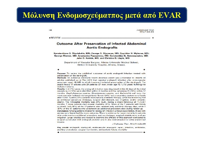 Ανασκόπηση της Βιβλιογραφίας • 129 reported cases (36 post TEVAR, 93 post EVAR) • Range of endograft infection 0. 2 -3% • Mean Time to presentation 15. 4 m (1 -96 m) 33% Early < 4 months - 67% > 4 months Numan F. et al. Management of endograft infections. J Cardiovasc Surg. 2011 Setacci C. et al. Management of abdominal endograft infection. J Cardiovasc Surg. 2010 Cernohorsky P. , JVS 2011