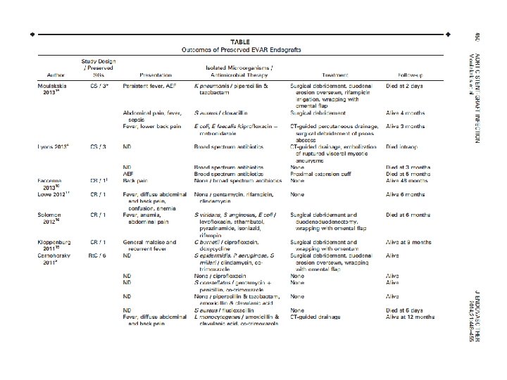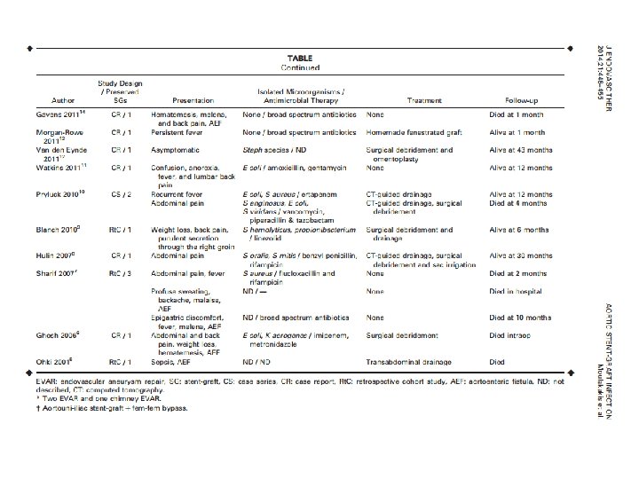 § 673 AAA – 19 (2. 8%) infected § 6 RAA (32%) § 15 (79%) positive blood cultures § Staphylococcus aureus (+) Clough RE, et al. Is endovascular repair of mycotic aortic aneurysms a durable treatment option? Eur J Vasc Endovasc Surg. 2009