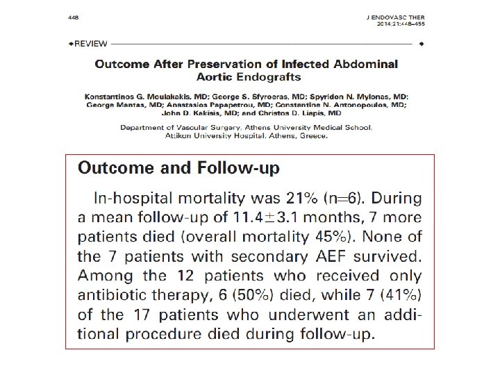 J Vasc Surg 2011 • 21 patients, 17 abdominal and four thoracic infected aortic aneurysms • 5 patients presented with fistulas • The overall in-hospital mortality was 19% (4/21) • 60% (3/5) in the fistula group and only 6% (1/16) in the nonfistula group. • There were no deaths in the 15 patients of the nonfistula group with an average patient follow-up of 22 months (range, 1 -54)