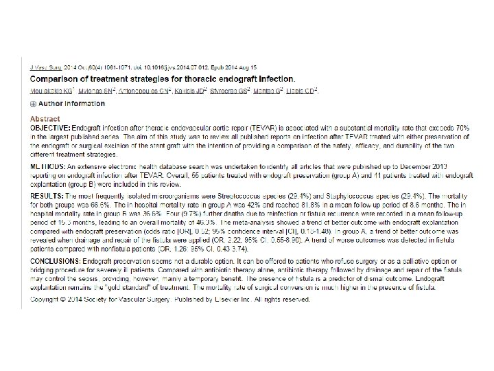 Review of the literature Clinical Outcomes in 102 pts Overall Mortality 40. 1% TEVAR 64. 7%, EVAR 30. 1% TEVAR Mortalit y EVAR Surgical Treat. Conservative Surgical Treat. Conservative (8/17) 47. 1% 17/60 28. 3% (4/6) 66. 6% (7/10) 70% Numan F. et al. Management of endograft infections. J Cardiovasc Surg . 2011