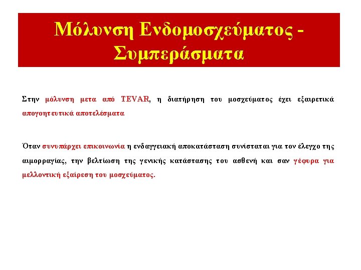 Πρόγνωση Θνητότητας λόγω Μόλυνσης του Ενδομοσχεύματος • • Fungal or gram negative species Presentation with severe sepsis AEF Bleeding requiring massive transfusion Advanced ASA physical status Age > 65 Renal insufficiency Stableford J. Endograft Infection after EVAR. October 2009