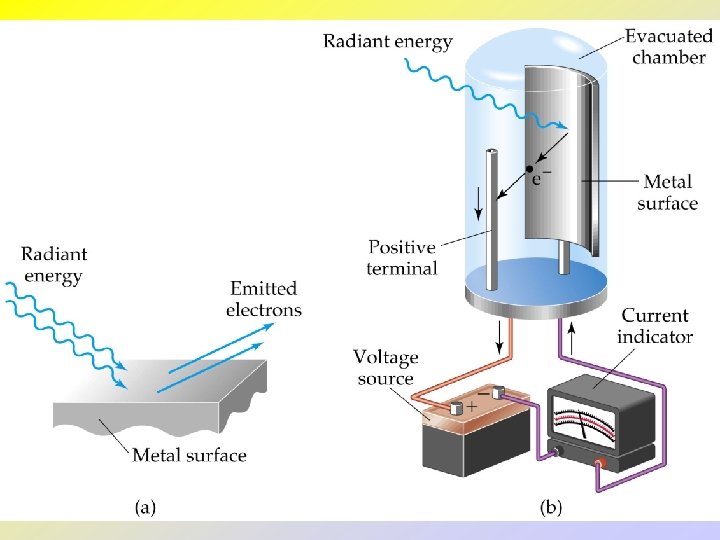 • • • The Photoelectric Effect and Photons The photoelectric effect provides evidence for the particle nature of light -- “quantization”. If light shines on the surface of a metal, there is a point at which electrons are ejected from the metal. The electrons will only be ejected once threshold frequency is reached. Below the threshold frequency, no electrons are ejected. Above threshold frequency, the number of electrons ejected depend on the intensity of the light.
