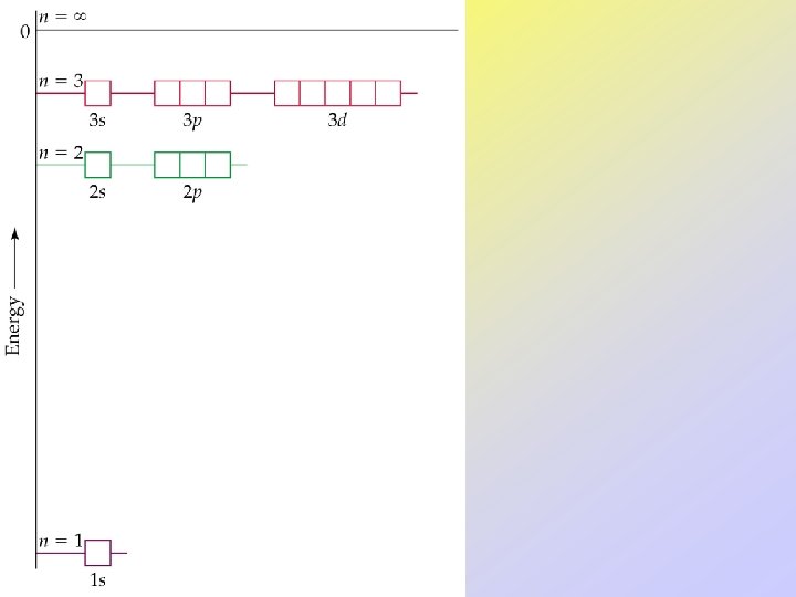 • Orbitals can be ranked in terms of energy to yield an Aufbau diagram. • Note that the following Aufbau diagram is for a single electron system. • As n increases, note that the spacing between energy levels becomes smaller.
