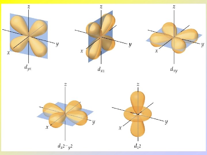 • • • The d and f-Orbitals There are five d and seven f-orbitals. Three of the d-orbitals lie in a plane bisecting the x-, yand z-axes. Two of the d-orbitals lie in a plane aligned along the x-, y- and z-axes. Four of the d-orbitals have four lobes each. One d-orbital has two lobes and a collar.