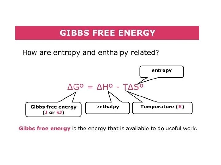 Gibbs Free Energy (G) The energy associated with a chemical reaction that can be used to do work.