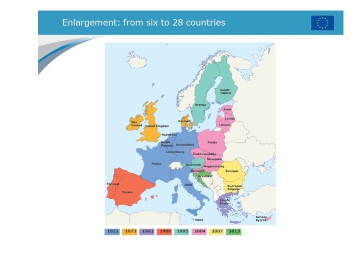 The EU • Background: – 1967: ECSC + EEC = EC – 1985: Schengen Agreement – 1991 -92: Maastricht Treaty » Creation of the euro: single currency integrating the currency of 11 western and central European nations » Incorporation of Schengen Area » Proposal for common foreign and defense policies » European Parliament, directly elected body of EU