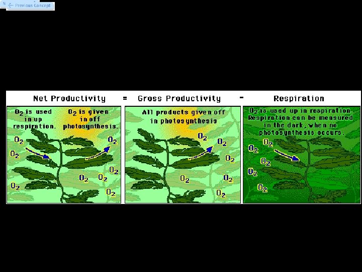 Primary Productivity • Can’t measure directly because photosynthesis/respiration always occurring • We can measure net productivity directly by measuring oxygen production in the light, when photosynthesis is occurring. • We can also measure respiration without photosynthesis by measuring O 2 consumption in the dark, when photosynthesis does not occur. • Since net productivity = gross productivity – respiration, we can calculate gross productivity.