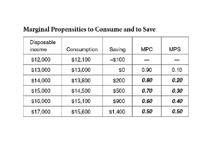 MPS = S/ DI MPC = C/ DI Because DI = S + C, MPC + MPS = 1. The additional spending that results when a consumer receives additional disposable income. Marginal Propensity to Consume