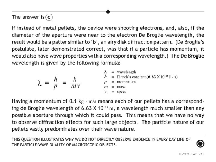 • Louis de Broglie (1892 – 1987) – French physicist and Nobel laureate • De Broglie speculated that if light sometimes behaves like a particle, perhaps material particles, such as electrons, also have wave properties. • In 1924 de Broglie hypothesized that a moving particle has a wave associated with it. The wavelength of the particle is related to the particle’s momentum (p=mv). = h =_h_ p mv On Gold Sheet • These waves associated with moving particles were called matter waves or, more commonly de Broglie waves. Question: If particles really are associated with a wave, why then have we never observed wave effects such as diffraction or interference for them?
