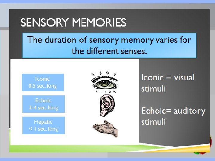 6. D Episodic memory – episodes of your life A. Iconic memory – visual stimuli B. Procedural memory - memories that relate to skills or habits, Examples the memory of how to brush your teeth or ride your bike C. Semantic memory - Semantic: memories of general, factual knowledge Examples state capitals, math facts, or historic events D. Episodic memory - memories from personally experienced events ; What you did on your 16 th birthday E. Short-term memory - Working memory, the new name for short-term memory, has a limited capacity (7± 2) and a short duration (20 seconds).