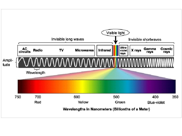 Light • Light – a form of electromagnetic energy that can be described in terms of wavelengths. – Travels though space in waves – Visible from 400 to 700 nanometers – Determines hue or color • Wavelength – the distance from the peak of one wave to the peak of the next • Amplitude – the height of the waves – determines the brightness of the stimulus • Purity – whether all the waves are the same or different – Affects perceived saturation