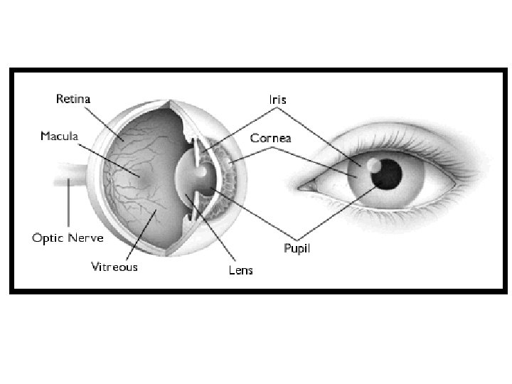 The Structure of the Eye (camera) (p. 111 -112) • sclera - the white, outer part of the eye that helps to maintain the shape of the eye and to protect it from injury • iris – the colored part of the eye • pupil – the opening in the center of the iris; appears black • cornea – clear membrane just in front of the eye – Bends light falling on the surface of the eye just enough to focus it at the back (brings image into focus) • lens – a transparent and somewhat flexible disk-shaped structure filled with a gelatin-like material – Bends light falling on the surface of the eye just enough to focus it at the back (brings image into focus) – Curvature – allows eye to focus on things up close (more curved) or far away (flatter) • Ability to curve decreases with age (thus stylish reading glasses)