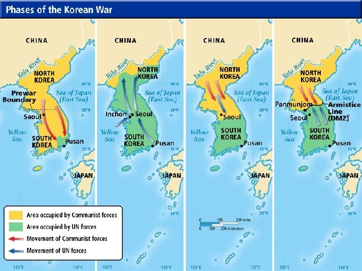 The Korean War Continued… As the North Korean army pushed into Seoul, the South Korean capital, the US readied its troops for a war against communism itself. At first, the war was a defensive one–a war to get the communists out of South Korea–and it went badly for the Allies. The North Korean army was well-disciplined, well-trained and well-equipped; Rhee’s forces, by contrast, were frightened, confused, and seemed inclined to flee the battlefield at any provocation. Also, it was one of the hottest and driest summers on record, and desperately thirsty American soldiers were often forced to drink water from rice paddies that had been fertilized with human waste. As a result, dangerous intestinal diseases and other illnesses were a constant threat. By the end of the summer, President Truman and General Douglas Mac. Arthur (1880 -1964), the commander in charge of the Asian theater, had decided on a new set of war aims. Now, for the Allies, the Korean War was an offensive one: It was a war to “liberate” the North from the communists. Initially, this new strategy was a success. An amphibious assault at Inchon pushed the North Koreans out of Seoul and back to their side of the 38 th parallel. But as American troops crossed the boundary and headed north toward the Yalu River, the border between North Korea and Communist China, the Chinese started to worry about protecting themselves from what they called “armed aggression against Chinese territory. ” Chinese leader Mao Zedong (1893 -1976) sent troops to North Korea and warned the US to keep away from the Yalu boundary unless it wanted full-scale war.