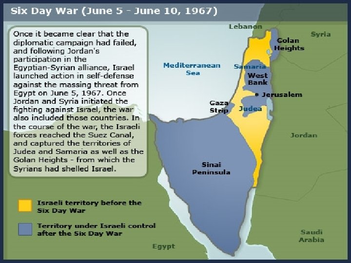 The 6 Day War, 1967 In 1967, Syria intensified its bombardment of Israeli settlements across the border, and Israel struck back by shooting down six Syrian Mi. G fighters. After Syria alleged in May 1967 that Israel was massing troops along the border, Egypt demanded the withdrawal of the U. N. from the Israel-Egypt cease-fire lines of the 1956 conflict. The U. N. peacekeepers left on May 19, and three days later Egypt closed the Strait of Tiran to Israeli shipping. On May 30, Jordan signed a mutual-defense treaty with Egypt and other Arab states… With every sign of a pan-Arab attack in the works, Israel launched a preemptive strike. On June 5, the Six-Day War began… By June 8, the Egyptian forces were defeated, and Israel held the Gaza Strip and the Sinai to the Suez Canal. Meanwhile, Jordan began shelling Israel, provoking a rapid response. . . Israel overran the West Bank and on June 7 captured the Old City of East Jerusalem. The chief chaplain of the Israel Defense Forces blew a ram's horn at the Western Wall to announce the reunification of East Jerusalem with the Israeli-administered western sector. To the north, Israel bombarded Syria's fortified Golan Heights. . . On June 11, a U. N. -brokered cease-fire took effect, and the Six. Day War was at an end… The U. N. Security Council called for a withdrawal from all the occupied regions, but Israel declined, permanently annexing East Jerusalem and setting up military administrations in the occupied territories… [A major term for Israeli negotiation is the recognition of the nation of Israel, which most Arab nations have refused to do. ] Egypt would eventually negotiate and make peace with Israel, and in 1982 the Sinai Peninsula was returned to Egypt in exchange for full diplomatic recognition of Israel. Egypt and Jordan later gave up their respective claims to the Gaza Strip and the West Bank to the Palestinians, who beginning in the 1990 s opened "land for peace" talks with Israel. The East Bank territory has since been returned to Jordan. In 2005, Israel left the Gaza Strip. Still, a permanent Israeli-Palestinian peace agreement remains elusive, as does an agreement with Syria to return the Golan Heights.