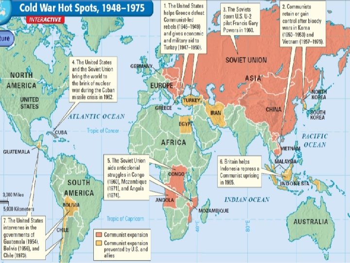 Truman Doctrine 1947 “In a dramatic speech to a joint session of Congress, President Harry S. Truman asks for U. S. assistance for Greece and Turkey to forestall communist domination of the two nations. Historians have often cited Truman's address, which came to be known as the Truman Doctrine, as the official declaration of the Cold War. In February 1947, the British government informed the United States that it could no longer furnish the economic and military assistance it had been providing to Greece and Turkey since the end of World War II… Truman requested $400 million in assistance for the two nations. Congress approved his request two months later… Truman's address outlined the broad parameters of U. S. Cold War foreign policy: the Soviet Union was the center of all communist activity and movements throughout the world; communism could attack through outside invasion or internal subversion; and the United States needed to provide military and economic assistance to protect nations from communist aggression. ” – www. history. com