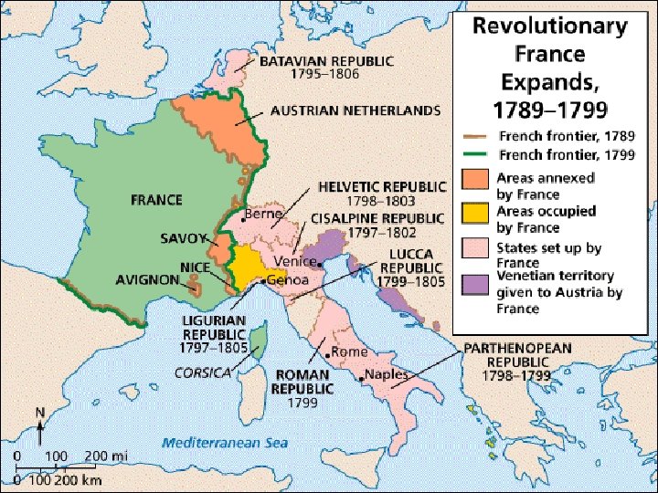 VI The Rise of Napoleon A) On August 22, 1795, the National Convention, composed largely of Girondins who had survived the Reign of Terror, approved a new constitution that created France’s first bicameral legislature. Executive power would lie in the hands of a five-member Directory appointed by parliament. Royalists and Jacobins protested the new regime but were silenced by the army, now led by a young and successful general named Napoleon Bonaparte (1769 -1821). B) The Directory’s four years in power were riddled with financial crises, popular discontent, and political corruption. By the late 1790 s, the directors relied almost entirely on the military to maintain their authority. On November 9, 1799, Bonaparte staged a coup d’état, abolishing the Directory and appointing himself France’s “first consul. ” The event marked the end of the French Revolution and the beginning of the Napoleonic era.
