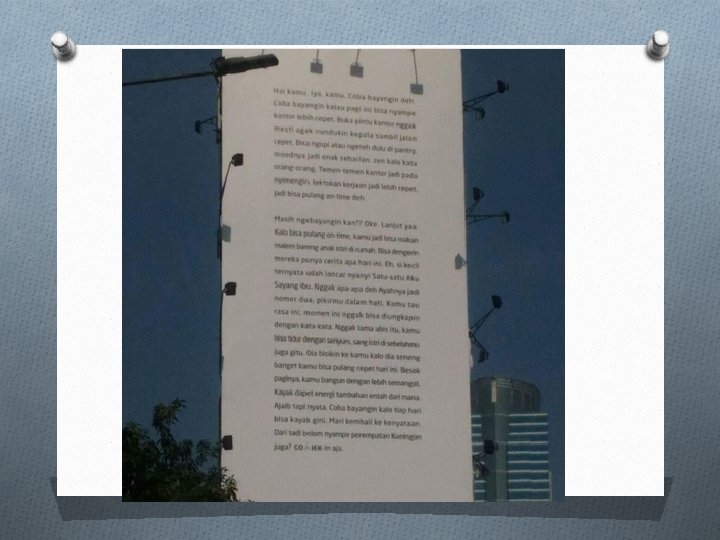 POETIC COPY O Jenis copy yang terakhir ini menggunakan gaya puisi. Menggunakan kata dan kalimat yang indah dan dirangkai dengan baik. Selain menggunakan puisi, copy ini juga bisa menggunakan pantun, syair, atau bahkan prosa singkat.