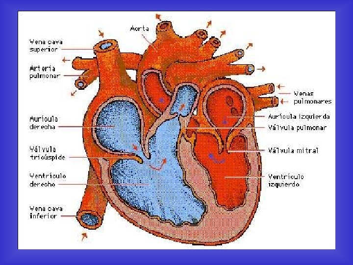 Válvulas del corazón: • El corazón recibe la sangre por las venas que provienen del cuerpo, llega a las aurículas y se expulsa a través de las arterias que salen de los ventrículos. • Las válvulas controlan el flujo de la sangre: -V. Tricúspide: controla el flujo sanguíneo entre AD y VD -V. Pulmonar: controla el flujo sanguíneo del VD a las AP, que son las que transportan la sangre a los pulmones para oxigenarla. -V. Mitral: da paso a la sangre oxigenada para que pase de la AI al VI. -V. Aórtica: da paso a la sangre oxigenada del VI a la Aórta.