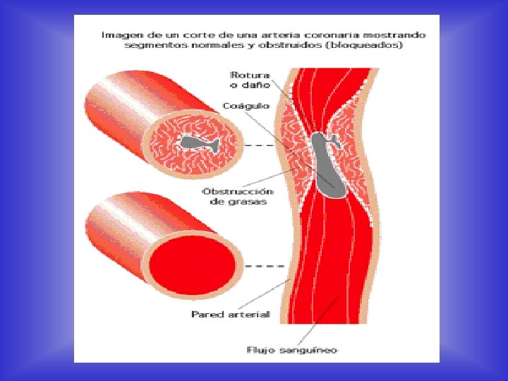 Infarto de Miocardio: • • • Cuando la arterias coronarias se obstruyen se produce el infarto de miocardio, conocido también como necrosis del músculo cardiaco. Se manifiesta principalmente por un dolor brusco e intenso en la zona del pecho, el cual se irradia hacia los hombros, los brazos y la espalda, acompañado de una sensación de opresión. Factores de riesgo: *Vida sedentaria. *Colesterol alto. *Alta presión sanguínea. *Tabaquismo. *Diabetes. *Obesidad. *Antecedentes familiares. *Consumo de drogas, especialmente cocaína.