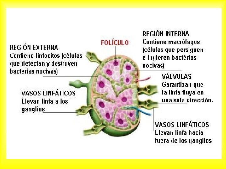 Funciones: • Función defensiva. En los ganglios linfáticos, los linfocitos se reproducen para dar respuesta a los agentes extraños. Encontramos macrófagos capaces de fagocitar sustancias dañinas a nuestro organismo. • Función de absorción de grasas. La mayor parte de las grasas son absorbidas por el sistema linfático y transportadas al sistema circulatorio. • Función de intercambio capilar. En el intercambio capilar las sustancias del tramo venoso son recuperadas por el sistema linfático. Recupera sustancias que el sistema circulatorio ha perdido en el intercambio capilar