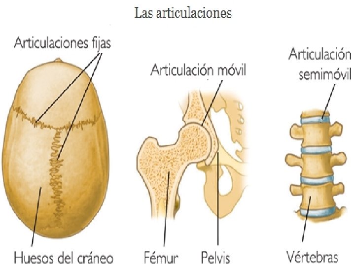 Las articulaciones móviles permiten movimientos amplios entre los huesos que las forman. Entre los huesos hay una bolsa sinovial que contiene un líquido incoloro y viscoso como lubricante. También pueden tener cartílagos resistentes, como los meniscos. En estas articulaciones, los huesos están unidos por potentes ligamentos que están formados por un tejido similar al de los tendones. Las articulaciones semimóviles permiten movimientos mucho menos amplios. El ejemplo clásico de articulación semimóvil es la existente entre las vértebras. Las articulaciones fijas son las uniones de dos o más huesos que están encajados, sin posibilidad de que se muevan. Ejemplos de este tipo de articulaciones son las de los huesos del cráneo.