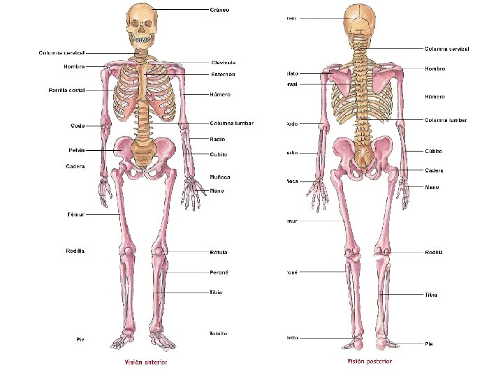 HUESOS QUE SE DEBEN CONOCER E IDENTIFICAR CORRECTAMENTE ► Cráneo y maxilar inferior ► Columna vertebral: vértebras cervicales (7), dorsales (12), lumbares (5) y pélvicas (sacro y cóxis) ► Costillas, esternón y clavículas. ► Húmero, cúbito y radio ► Cadera (ilion, isquion y pubis) ► Fémur, rótula, tibia y peroné