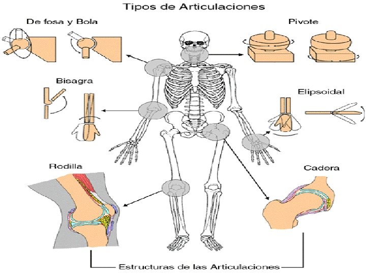 TIPOS DE ARTICULACIONES MÓVILES ► Articulaciones de cabeza y cavidad - hombro, cadera - permiten movimientos hacia atrás, hacia delante, de lado y de rotación ► Articulaciones de bisagra - dedos de manos y pies, rodillas, codos - permiten sólo movimientos de doblar (flexión) y de enderezar (extensión). ► Articulaciones de pivote (o de eje) - cuello - permiten movimientos de rotación limitados ► Articulaciones elipsoidales - como la de la muñeca - permiten todo tipo de movimientos excepto los de eje