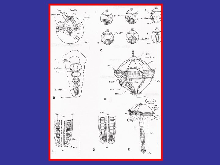 Diferentes divisiones del cuerpo según su procedencia de la trocófora g: zona de proliferación p: peristomio pr: prostomio A. - según Goodrich 1887. B. - Woltereck, 1905. C. - Anderson, 1959. D. - Schröder & Hermans, 1975.