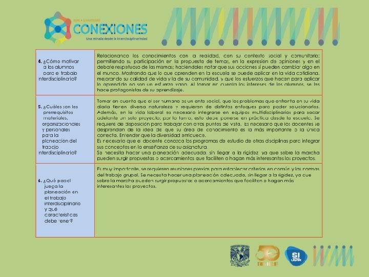 3. Puntos a tomarse en cuenta para la implementación de proyectos interdisciplinarios. AVANCES Coincidencia de programas Intereses comunes. Trabajo colaborativo Se tienen más opciones metodológicas. � Se rompieron paradigmas � � TROPIEZOS • • • Tiempos / horarios Características del alumnado ya que en teoría ya manejan trabajo por proyectos. No hay madurez por parte de los alumnos para la responsabilidad de proyectos. Rotación de profesores. No hay calendarios de todo el proyecto y no ha podido realizarse una planeación real. SOLUCIONES O PROPUESTAS ✔ Proyecto por grado o por materia, no por docente. ✔ Delimitar alcances para que la mayor parte de los proyectos se lleven en clase. ✔ Uso de la tecnología. ✔ Establecer estrategias para avanzar en los objetivos de los profesores.