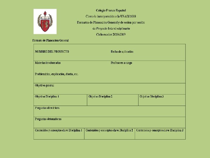 Colegio Franco Español Clave de incorporación a la UNAM 1008 Formatos de Planeación General y de sesión por sesión de Proyecto Interdisciplinario Ciclo escolar 2018 -2019 5 g. Formato de Planeación General NOMBRE DEL PROYECTO Fecha de aplicación Materias involucradas Profesores a cargo Problemática, explicación, diseño, etc. Objetivo general Objetivo Disciplina 1 Objetivo Disciplina 2 Objetivo Disciplina 3 Preguntas directrices Preguntas detonadoras Contenidos y conceptos clave Disciplina 1 Contenidos y conceptos clave Disciplina 2 Actividades Disciplina 1 Contenidos y conceptos clave Disciplina 3 Material Evaluación Actividades Disciplina 2 Actividades Disciplina 3 19