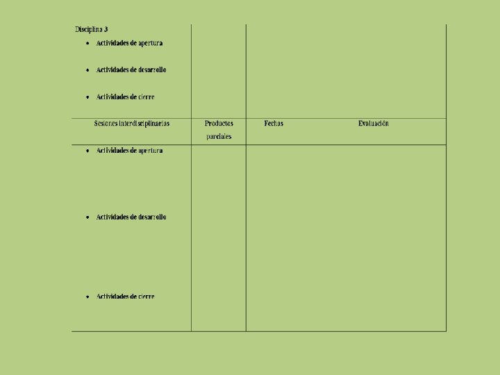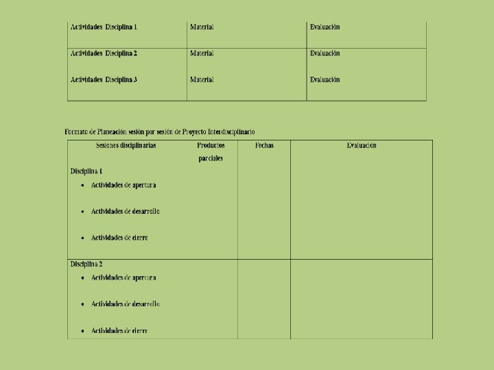Formato de Planeación sesión por sesión de Proyecto Interdisciplinario Sesiones disciplinarias Productos Fechas Evaluación parciales Disciplina 1 ∙ Actividades de apertura ∙ Actividades de desarrollo ∙ Actividades de cierre Disciplina 2 ∙ Actividades de apertura ∙ Actividades de desarrollo ∙ Actividades de cierre Disciplina 3 ∙ Actividades de apertura ∙ Actividades de desarrollo ∙ Actividades de cierre 20