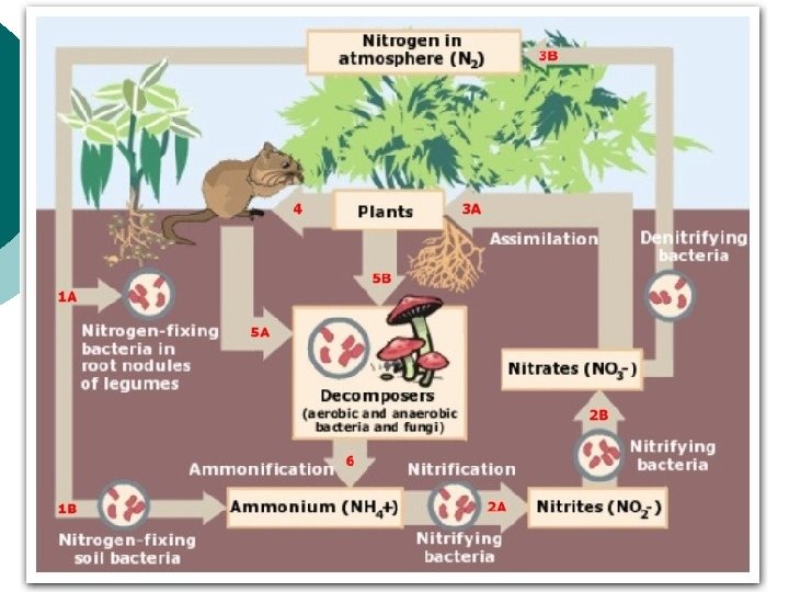 Nitrogen cycle ¡ ¡ ¡ Main reserve in the atmosphere Living things must get N from ammonium (NH 4) or nitrate (NO 3) N from the atmosphere must be fixed ¡ l l Change N 2 into ammonium or nitrate Rhizobium (bacteria living in roots of legumes) Industrial Lightning Burning fossil fuels